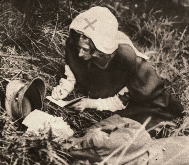 33. A Red Cross nurse writes the last words of a British soldier during WWI.