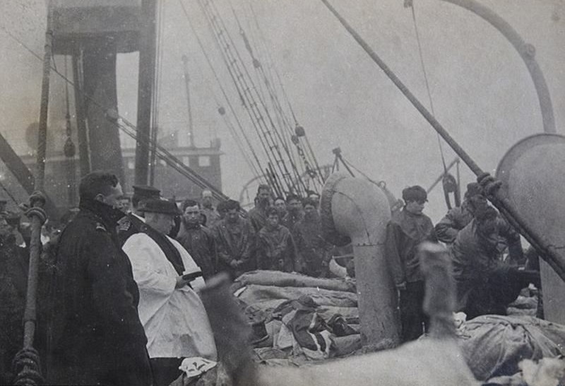 36. A priest prays over those who died in the Titanic accident before burying them at sea.