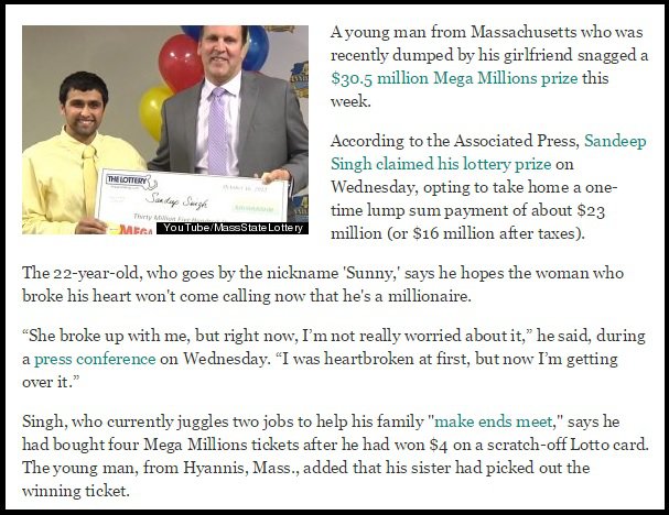 You know what’s worse than getting dumped by your girlfriend? Nothing. Nothing’s worse than that. Maybe that’s why, even God took pity on this poor kid who’d gotten his heart broken and gave him $30.5 million in lottery winnings. Ladies and gentlemen, meet Sandeep Singh.